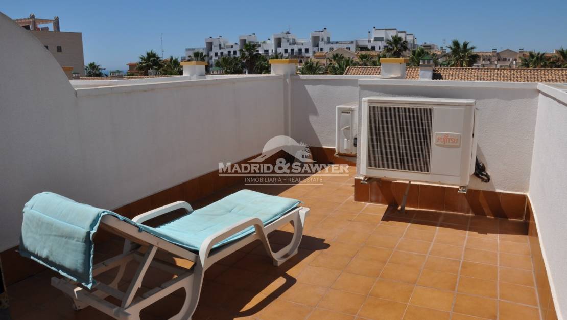 Fantastico duplex adosado de dos dormitorios y dos baños en el residencial Aldeas de Aguamarina II. Situado en un residencial privado con amplias zonas verdes y piscina comunitaria, este adosado cuenta en la planta baja con un porche de quince metros cuadrados, en la entrada a la vivienda encontramos el salon, seguido de un trastero, cocina totalmente equipada con electrodomesticos, patio trasero de dieciocho metros cuadrados y un trastero. En la planta primera encontramos un dormitorio, baño completo y dormitorio principal con balcon y vistas a la zona comun y la piscina. En la planta segunda se encuentra el solarium con vistas al mar. La vivienda se vende amueblada con electrodomesticos. Cerca de todos los servicios. El centro comercial La Zenia boulevard se encuentra a tan solo cinco minutos en coche. Facil acceso a la autopista.