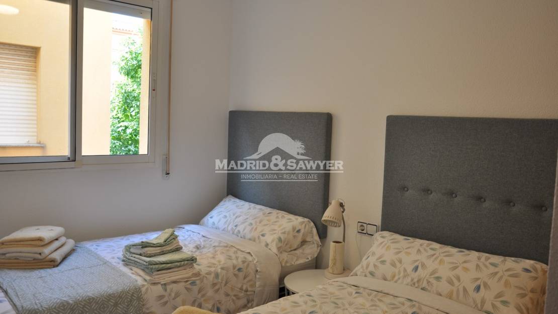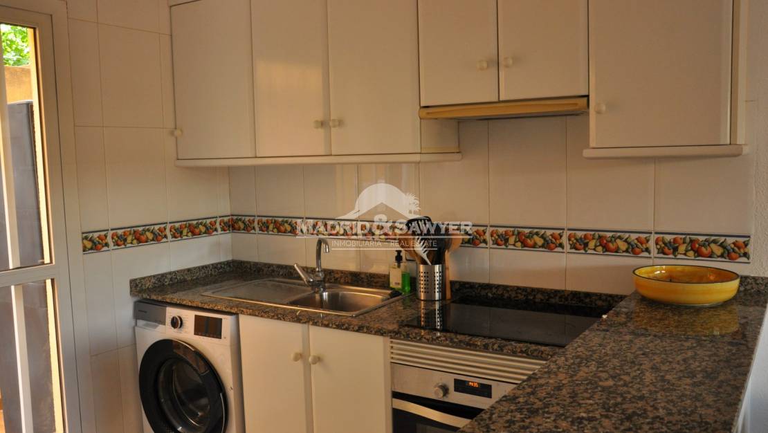Fabulous 3-bedroom, newly furnished house for rent in Aguamarina! This home, with all brand-new furniture, has 3 bedrooms, 2 bathrooms, and a parking space! Upon entering the house, you'll find the living-dining room with the fully equipped kitchen at the end, providing access to a utility room and the communal swimming pool. There is also a complete bathroom on the ground floor. On the 1st floor, you'll find the second full bathroom and two bedrooms, one with two single beds and the other with a double bed. On the 2nd floor, there is another large bedroom with two single beds and access to the solarium. The house is located within a gated community, about 2 minutes from the beaches of Campoamor and Cabo Roig, 5 minutes from La Zenia Boulevard shopping center, 10 minutes from three 18-hole golf courses, and about 40 minutes from Alicante and Corvera airports.