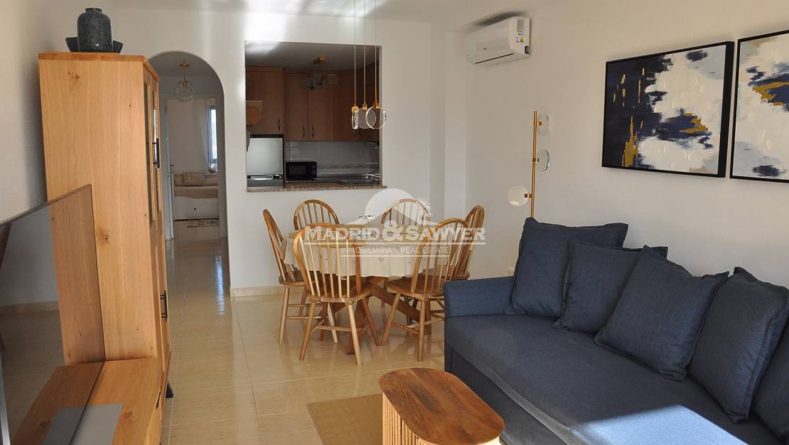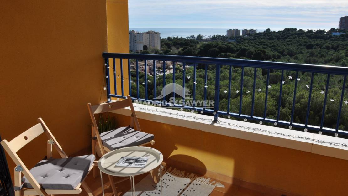 Upon entering the apartment, you'll find the entrance hall with the bathroom to the right. At the far end is the fully equipped open-plan kitchen, with the sunny living room to the right of the kitchen and access to a balcony overlooking the Mediterranean Sea. To the left of the kitchen are the two bedrooms, each with two single beds, and the master bedroom has an en-suite bathroom. This apartment is located in Campoamor with incredible views of the pine forest and the sea. It is close to all amenities, approximately a 5-minute drive from the La Zenia Boulevard shopping center, about 10 minutes from three 18-hole golf courses, and about 40 minutes from Alicante and Corvera airports.