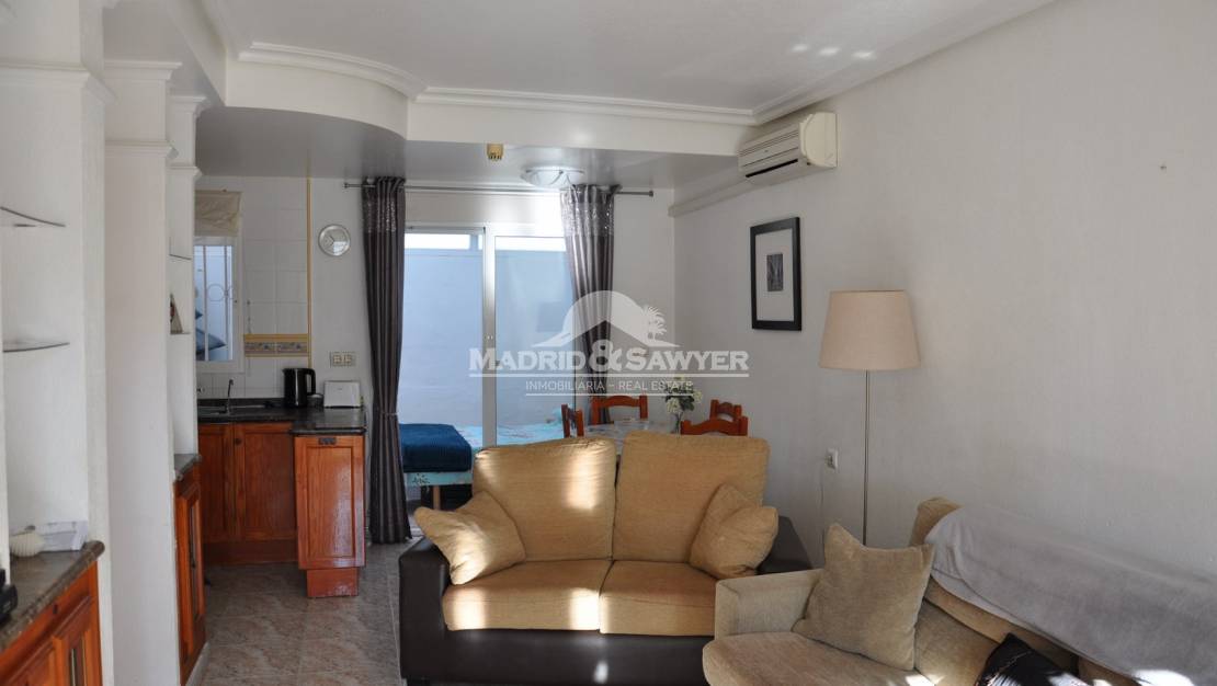Fabulous 2-bedroom, 2-bathroom house for rent in La Regia! This house is located in a gated community with a communal pool, within easy reach of all amenities. Upon entering the property, you'll find the living-dining room with an open-plan kitchen at the far end and access to a bedroom. There is also a toilet on the ground floor. Upstairs, you'll find the two bedrooms, one with a double bed and the other with two single beds, as well as a complete bathroom. It's approximately a 2-minute drive from the La Zenia Boulevard shopping center, 10 minutes from three 18-hole golf courses, and about 40 minutes by car from Alicante and Corvera airports.