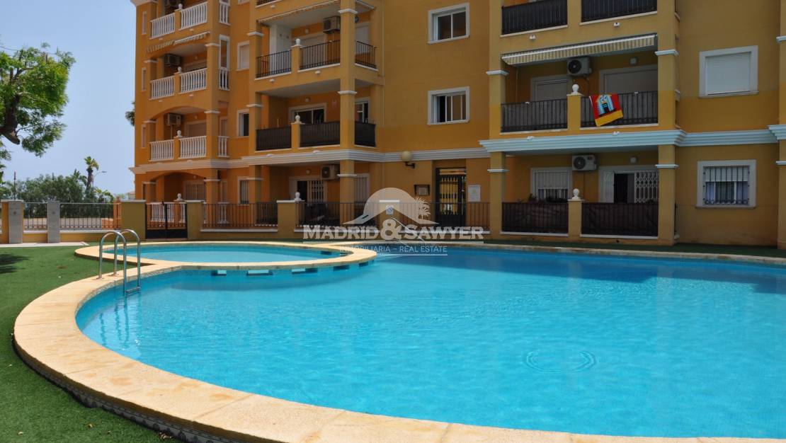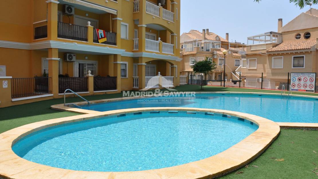 Apartamento situado en Torrevieja, disponible para todo el año, con dos habitaciones, un baño, cocina americana y equipada con electrodomésticos, amueblado, aire acondicionado, salón comedor con salida a la terraza, parking y piscina comunitaria.