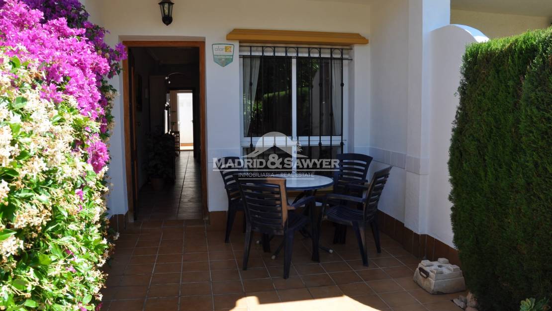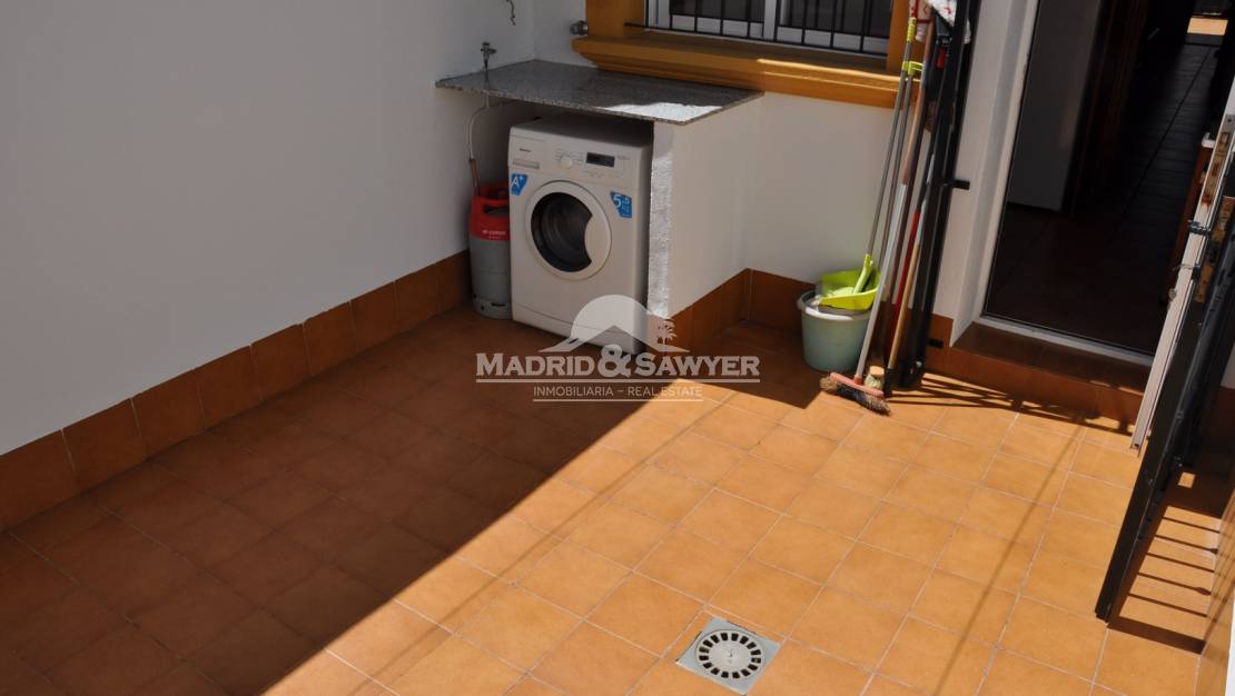 Fantastico duplex adosado de dos dormitorios y dos baños en el residencial Aldeas de Aguamarina II. Situado en un residencial privado con amplias zonas verdes y piscina comunitaria, este adosado cuenta en la planta baja con un porche de quince metros cuadrados, en la entrada a la vivienda encontramos el salon, seguido de un trastero, cocina totalmente equipada con electrodomesticos, patio trasero de dieciocho metros cuadrados y un trastero. En la planta primera encontramos un dormitorio, baño completo y dormitorio principal con balcon y vistas a la zona comun y la piscina. En la planta segunda se encuentra el solarium con vistas al mar. La vivienda se vende amueblada con electrodomesticos. Cerca de todos los servicios. El centro comercial La Zenia boulevard se encuentra a tan solo cinco minutos en coche. Facil acceso a la autopista.