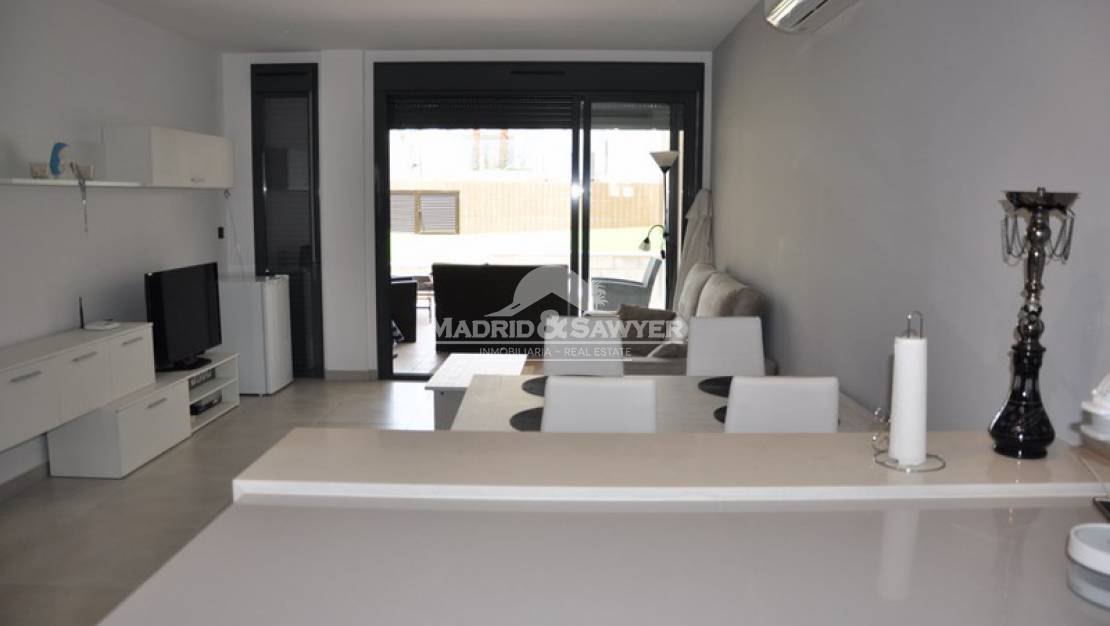 Ground floor bungalow with two bedrooms and two bathrooms with terrace equipped with garden furniture. This property is located in the Residential Oasis Beach VIII in Punta Prima. At the entrance you have a small garden, accessing the house on the right has the fully equipped kitchen with appliances, in the background the dining room with access to the terrace and community area. On the left there are two bedrooms and two bathrooms, the master bedroom has the bathroom en suite. The house is sold partially furnished, has air conditioning and underground parking. The residential has a swimming pool for adults and children, jacuzzi and large green areas. Close to all services.