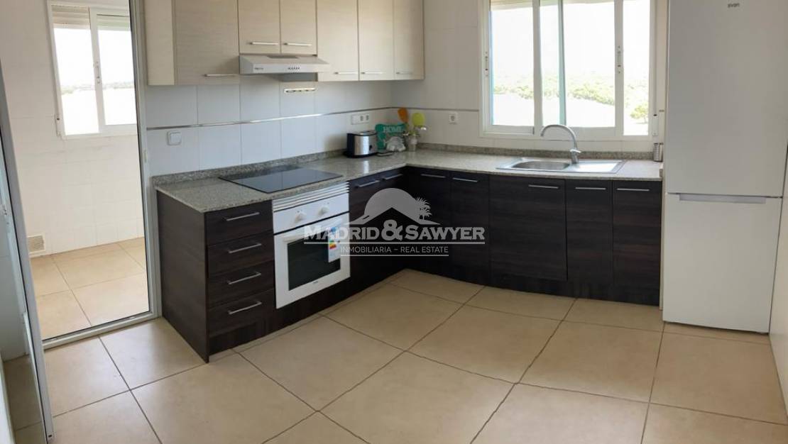 This new & wonderful 3 bedroom, 2 bathroom penthouse is available for rent and it is situated in the lovely village of Campoamor! Upon entering the property we find ourselves in the hallway with the fully equpped & spacious kitchen to the left, which leads out to a small storage room with the washing machine. Following on from the entrance hallway, on the left there is the first bedroom with a single bed and a fitted wardrobe, next to this bedroom is the 2nd bedroom with a double bed and a fitted wardrobe and infront of these bedrooms to the right of the hallway is a fully equipped shower room. Next to the shower room is a fully equipped complete bathroom. At the end of the hallway we find the spacious and very bright lounge with access to the large balcony that offers spectacular views of all of Campoamor and sea views. To the left of the lounge there is the third double bedroom, also with a fitted wardrobe and access to the balcony. This property has central air conditioning and heating and there is also a communal pool. During the summer months the beach at Campoamor offers a wide variety of water sports. The property is located close to all amenities and is only 5 minutes in the car from the La Zenia Boulevard shopping centre and only 45 minutes from both Alicante & Corvera airports.