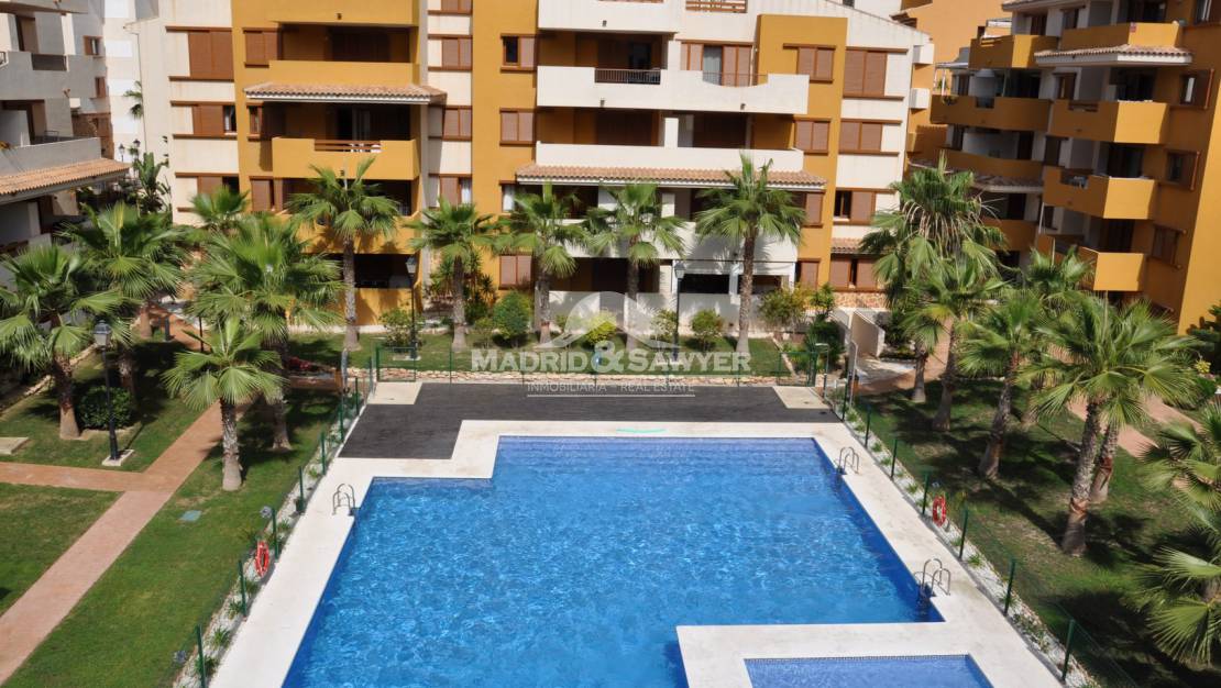 This fabulous apartment is for sale, situated in Punta Prima, only 150m from the beach! Upon entering the property we find ourselves in the fully equpped kitchen which leads to the dining area and lounge, all in open plan, to the left of the kitchen is a bedroom with 2 single beds, infront of this bedroom is the complete bathroom. To the right of the lounge is the master bedroom with a double bed and ensuite bathroom. From the lounge you have large patio windows which lead onto the large balcony with beautiful views of the communal pool area. The property also has an underground parking space. Located only 5 minutes away from the Punta Marina commercial centre with shops, bars, restaurants & chemists and easy access to Torrevieja or La Zenia Boulevard shopping centre. The property is approxiamtely 40 minutes from Alicante and Corvera airports, and close to various 18 hole golf courses. The price also includes an underground parking space and storage room.