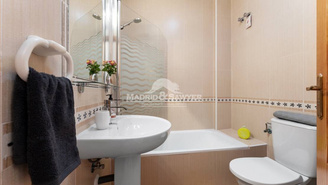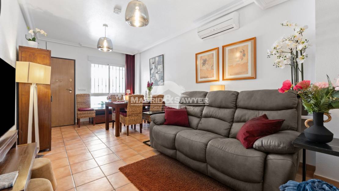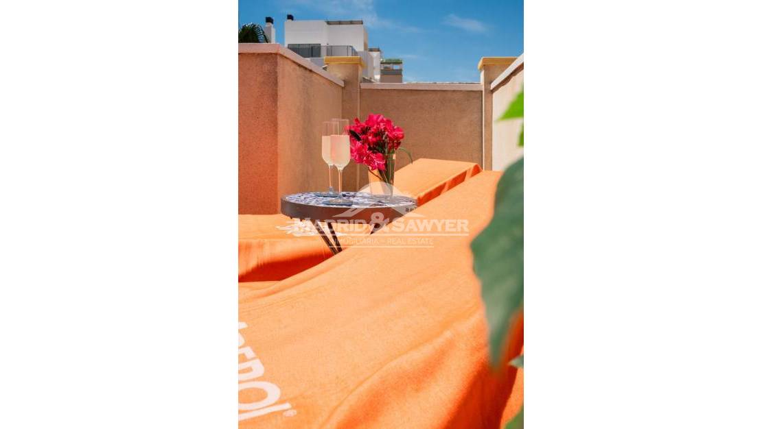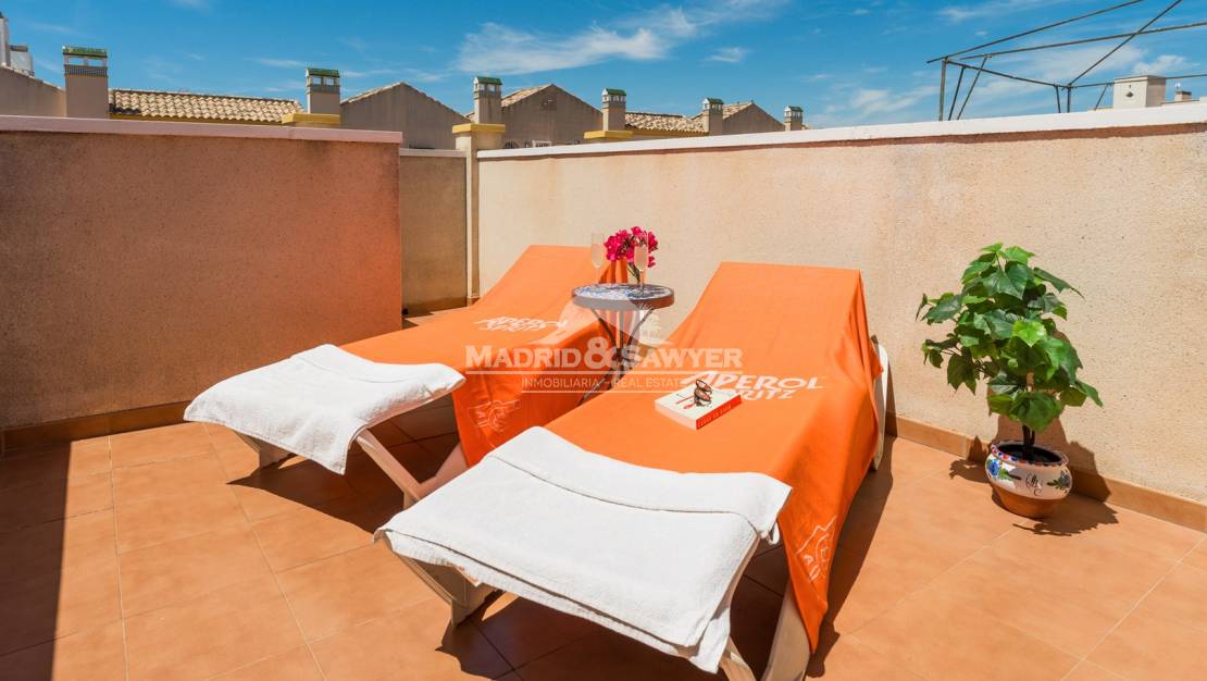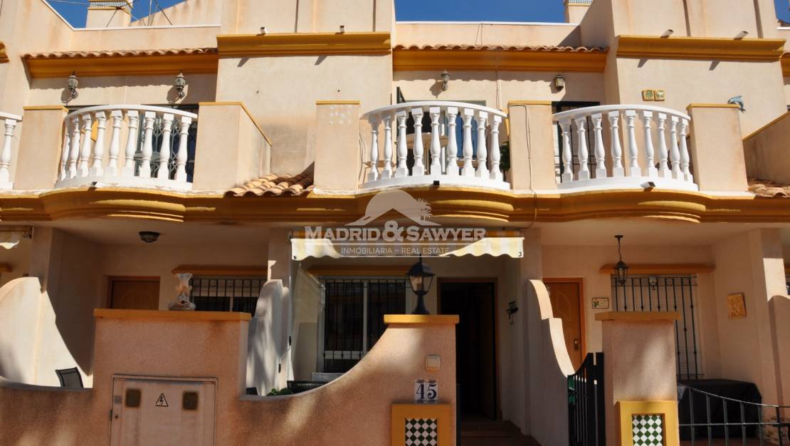 This lovely 2 bedroom house located in Aguamarina in a private complex is available for holiday rentals! Upon entering the property we find ourselves in the lounge with the independant and fully equipped kitchen at the rear of the property with access to a small patio, there is also a toilet downstairs. Following the staircase upstairs, there are 2 bedrooms, one with a double bed and access to a sunny balcony and the second bedroom with 2 single beds, there is also a complete bathroom. Following the staircase again, we have access to the solarium. Situated close to all amenities such as Drs. surgery, chemists, supermarkets, bars and restaurants. The shopping centre La Zenia Boulevard is only 5 minutes away by car, there are three 18 hole golf courses only 10 minutes away by car and Alicante & Corvera airports are approximately 40 minutes away by car.